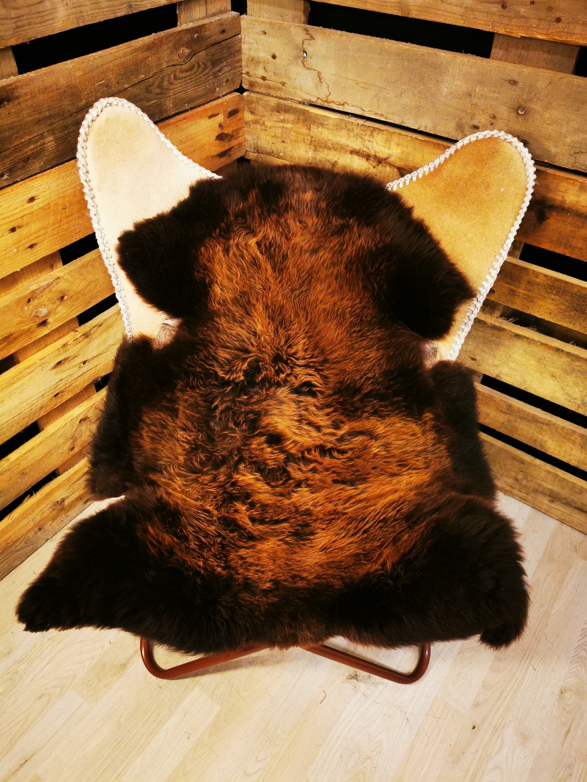 Europæisk Flame stammer fra får, der græsser frit på europæiske enge. Pelsens naturlige tekstur og farve afspejler det harmoniske samspil mellem natur og dyrevelfærd, hvilket gør skindet til en autentisk og værdifuld tilføjelse til dit hjem.