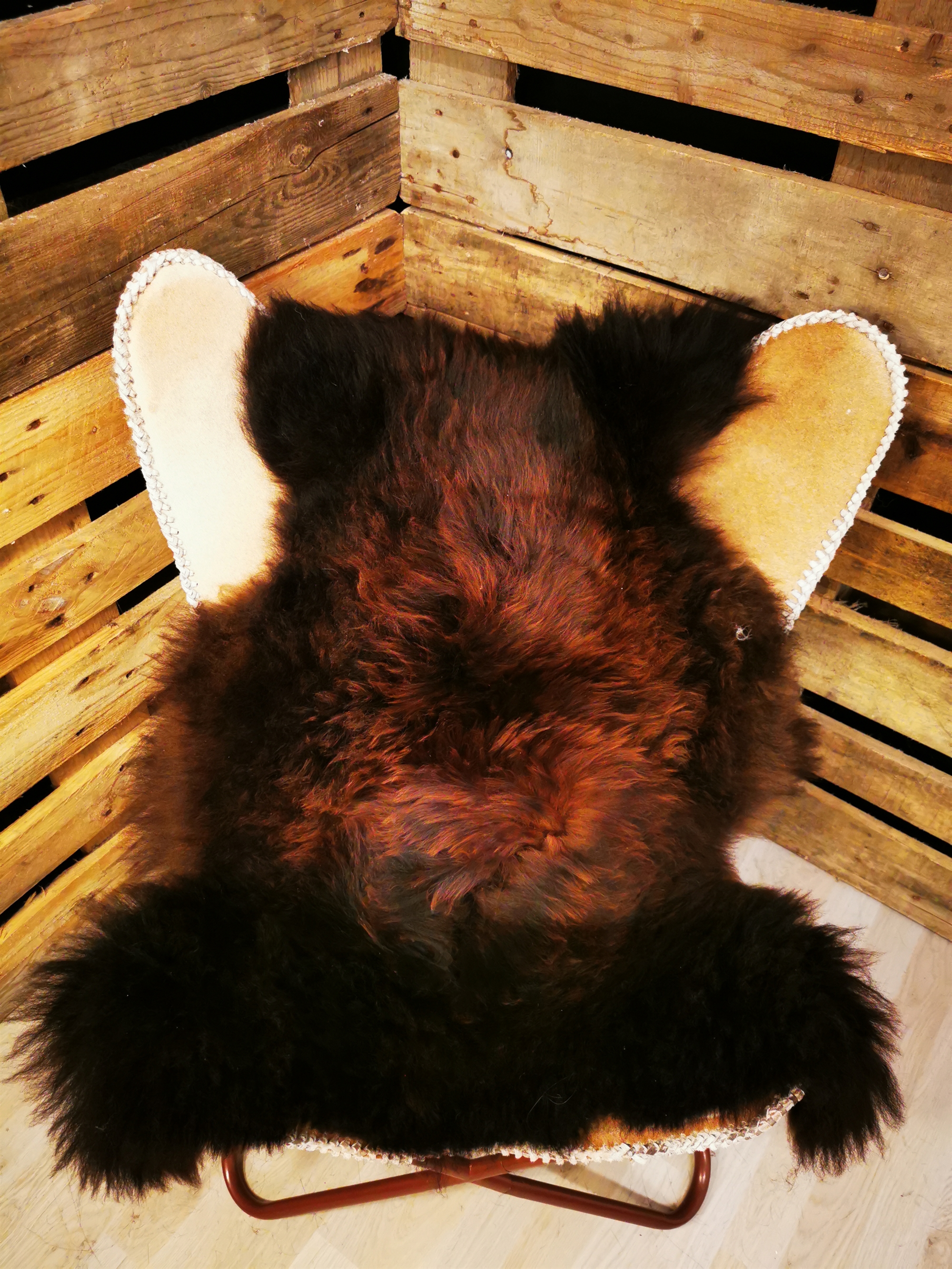 Europæisk Flame stammer fra får, der græsser frit på europæiske enge. Pelsens naturlige tekstur og farve afspejler det harmoniske samspil mellem natur og dyrevelfærd, hvilket gør skindet til en autentisk og værdifuld tilføjelse til dit hjem.