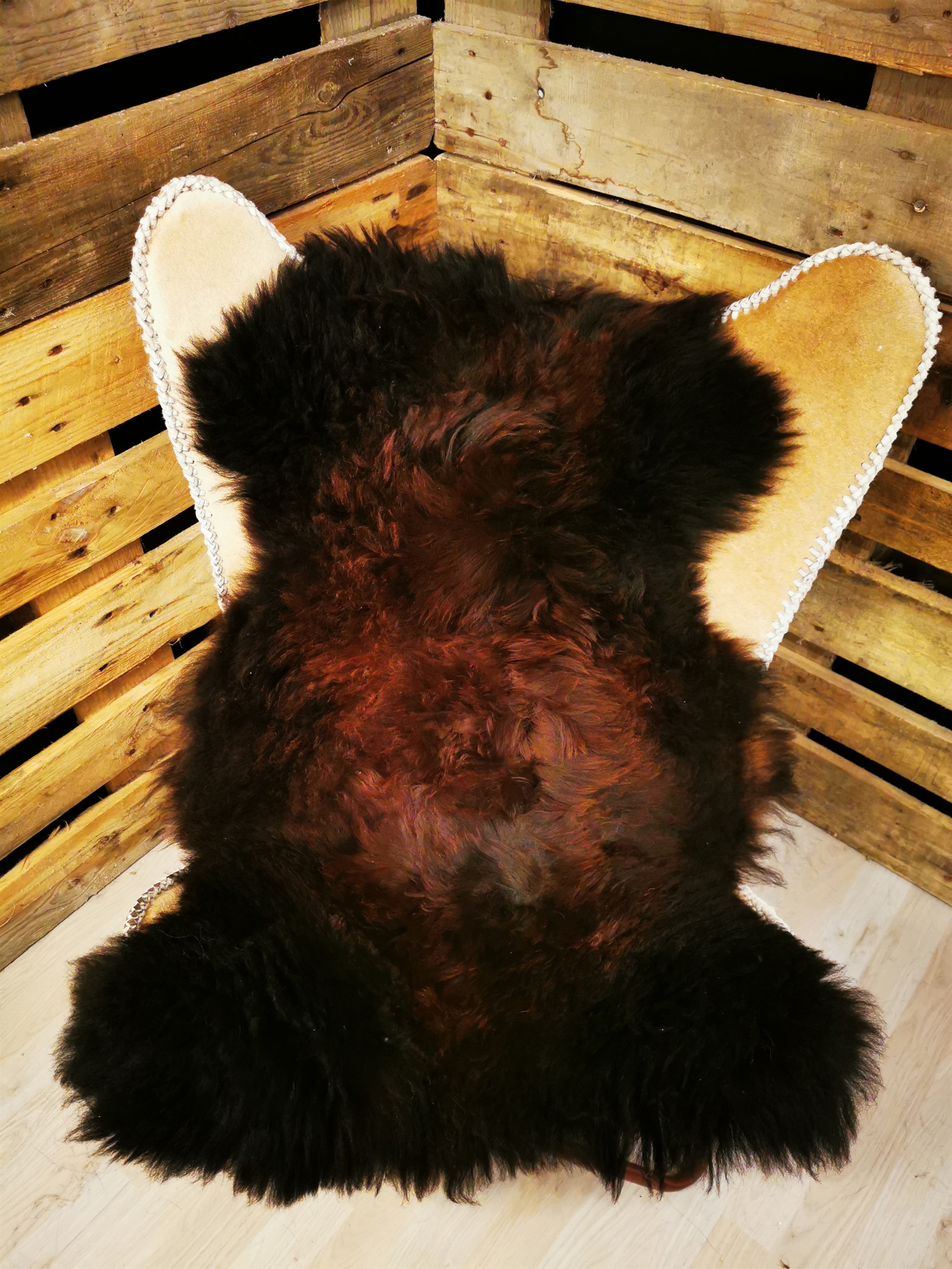 Vores Europæisk Flame lammeskind er en ægte fryd for øjet. Den varme brune basefarve, kombineret med de gyldne highlights, skaber en fortryllende kontrast og en luksuriøs glød. De naturlige variationer i pelsens struktur gør hvert skind til et unikt kunstværk.