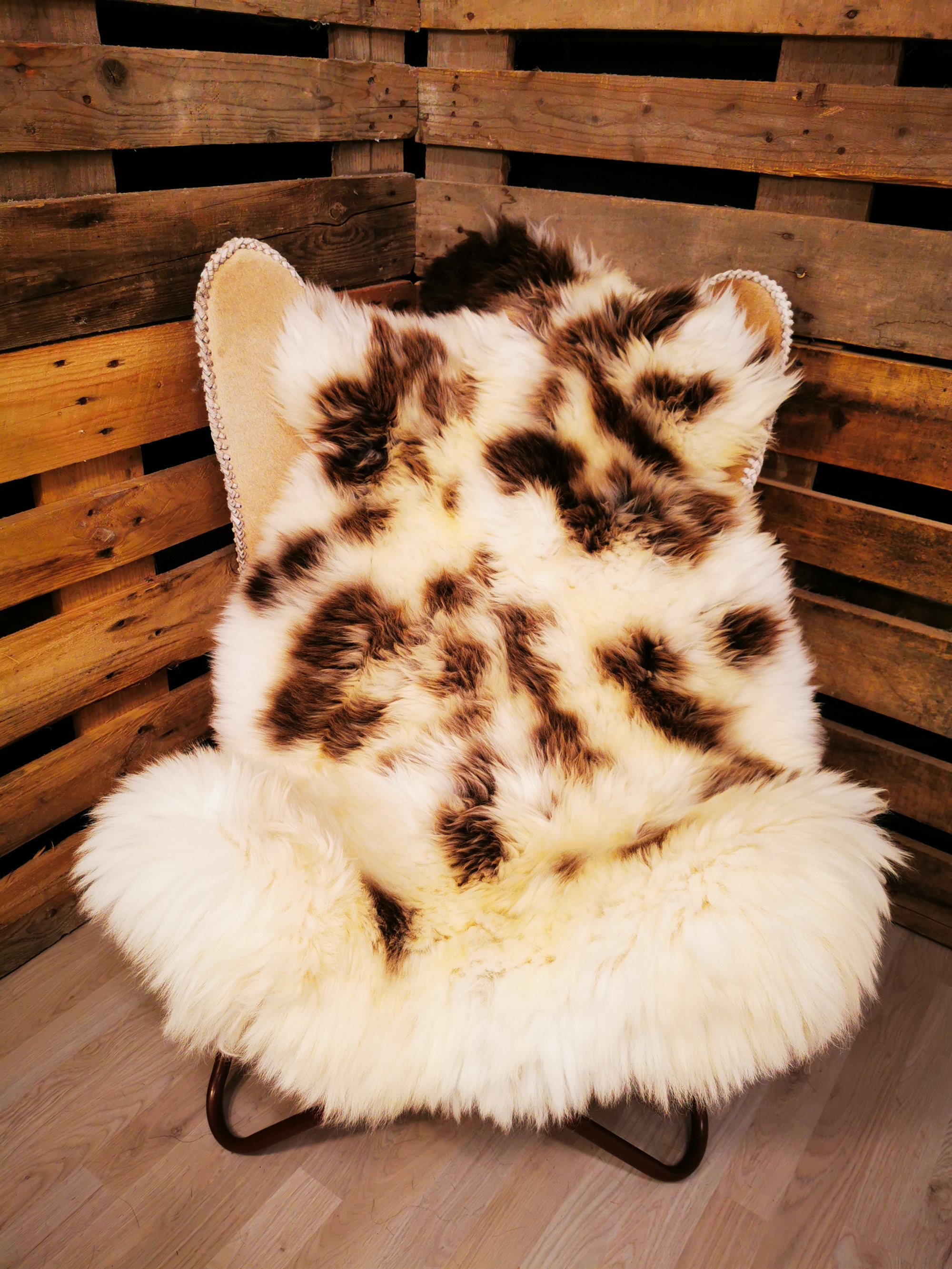 Skindet måler 130cm. Jacobs får er en meget sjælden fårerace som oprindeligt stammer fra Asien. Racen bliver omtalt i bibelen i forbindelse med apostlen Jacob (deraf navnet) og i 18hundrede tallet kom Jacob fåret til England. Jacob fåret er kendetegnet ved sort/grå/brun hvide farveaftegninger, både han og hun får kan have op til 6 horn og dets uld er højt værdsat. Skindene er store, klippede og meget fyldige. Skindet er både dekorativt men også meget velegnet som brugsskind, de sarte naturlige farvenuancer giver utallige anvendelsesmuligheder og som brugs og dekorationsskind på f.eks. spisebordsstole vil de være yderst velegnede.