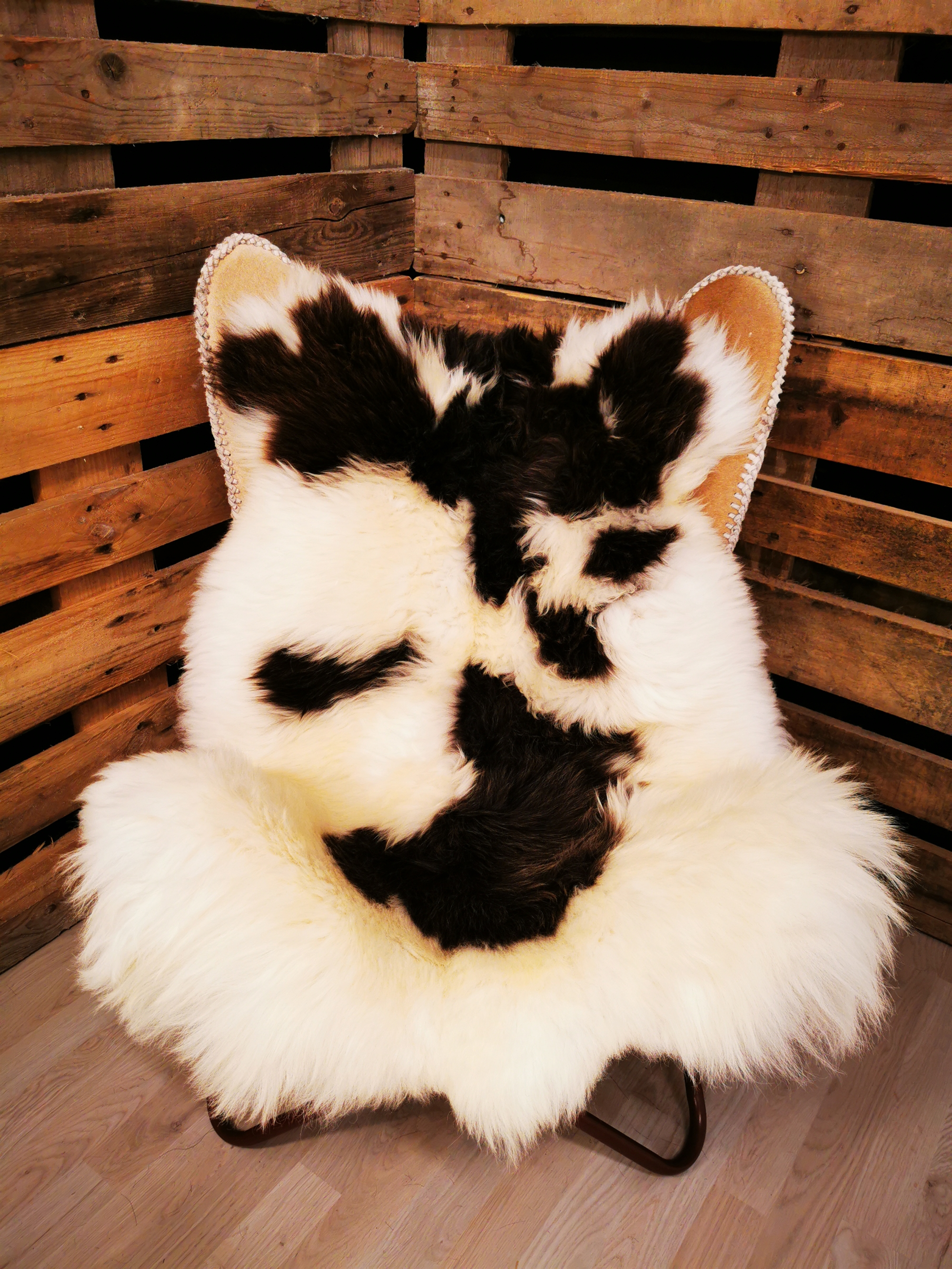 Skindet måler 120cm. Jacobs får er en meget sjælden fårerace som oprindeligt stammer fra Asien. Racen bliver omtalt i bibelen i forbindelse med apostlen Jacob (deraf navnet) og i 18hundrede tallet kom Jacob fåret til England. Jacob fåret er kendetegnet ved sort/grå/brun hvide farveaftegninger, både han og hun får kan have op til 6 horn og dets uld er højt værdsat. Skindene er store, klippede og meget fyldige. Skindet er både dekorativt men også meget velegnet som brugsskind, de sarte naturlige farvenuancer giver utallige anvendelsesmuligheder og som brugs og dekorationsskind på f.eks. spisebordsstole vil de være yderst velegnede.
