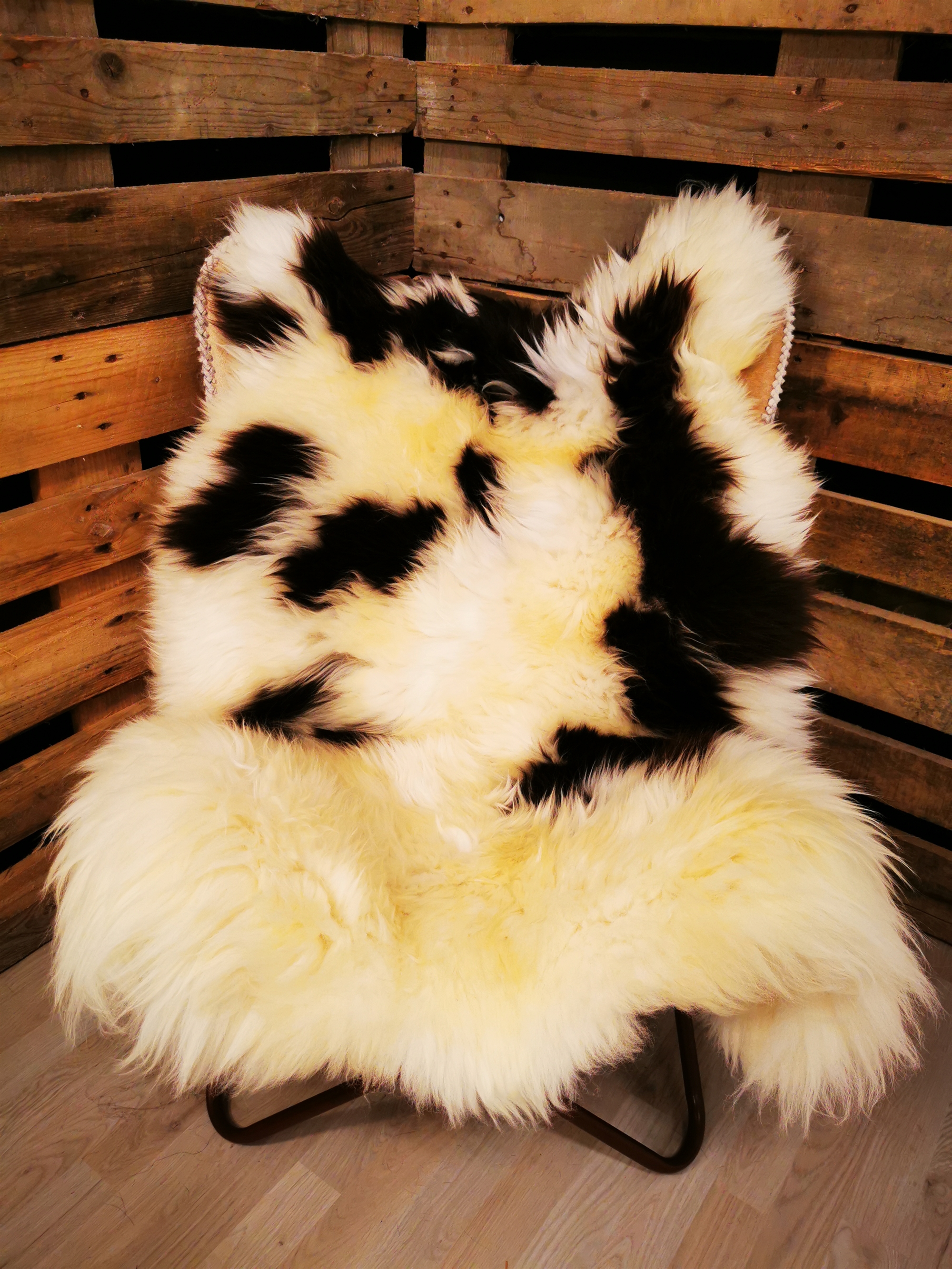 Skindet måler 130cm. Jacobs får er en meget sjælden fårerace som oprindeligt stammer fra Asien. Racen bliver omtalt i bibelen i forbindelse med apostlen Jacob (deraf navnet) og i 18hundrede tallet kom Jacob fåret til England. Jacob fåret er kendetegnet ved sort/grå/brun hvide farveaftegninger, både han og hun får kan have op til 6 horn og dets uld er højt værdsat. Skindene er store, klippede og meget fyldige. Skindet er både dekorativt men også meget velegnet som brugsskind, de sarte naturlige farvenuancer giver utallige anvendelsesmuligheder og som brugs og dekorationsskind på f.eks. spisebordsstole vil de være yderst velegnede.