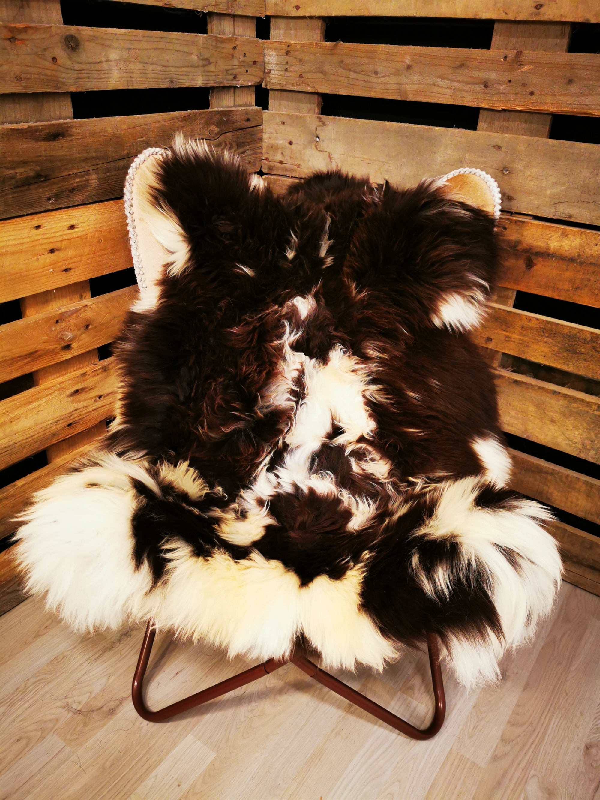 Skindet måler 120cm. Jacobs får er en meget sjælden fårerace som oprindeligt stammer fra Asien. Racen bliver omtalt i bibelen i forbindelse med apostlen Jacob (deraf navnet) og i 18hundrede tallet kom Jacob fåret til England. Jacob fåret er kendetegnet ved sort/grå/brun hvide farveaftegninger, både han og hun får kan have op til 6 horn og dets uld er højt værdsat. Skindene er store, klippede og meget fyldige. Skindet er både dekorativt men også meget velegnet som brugsskind, de sarte naturlige farvenuancer giver utallige anvendelsesmuligheder og som brugs og dekorationsskind på f.eks. spisebordsstole vil de være yderst velegnede.