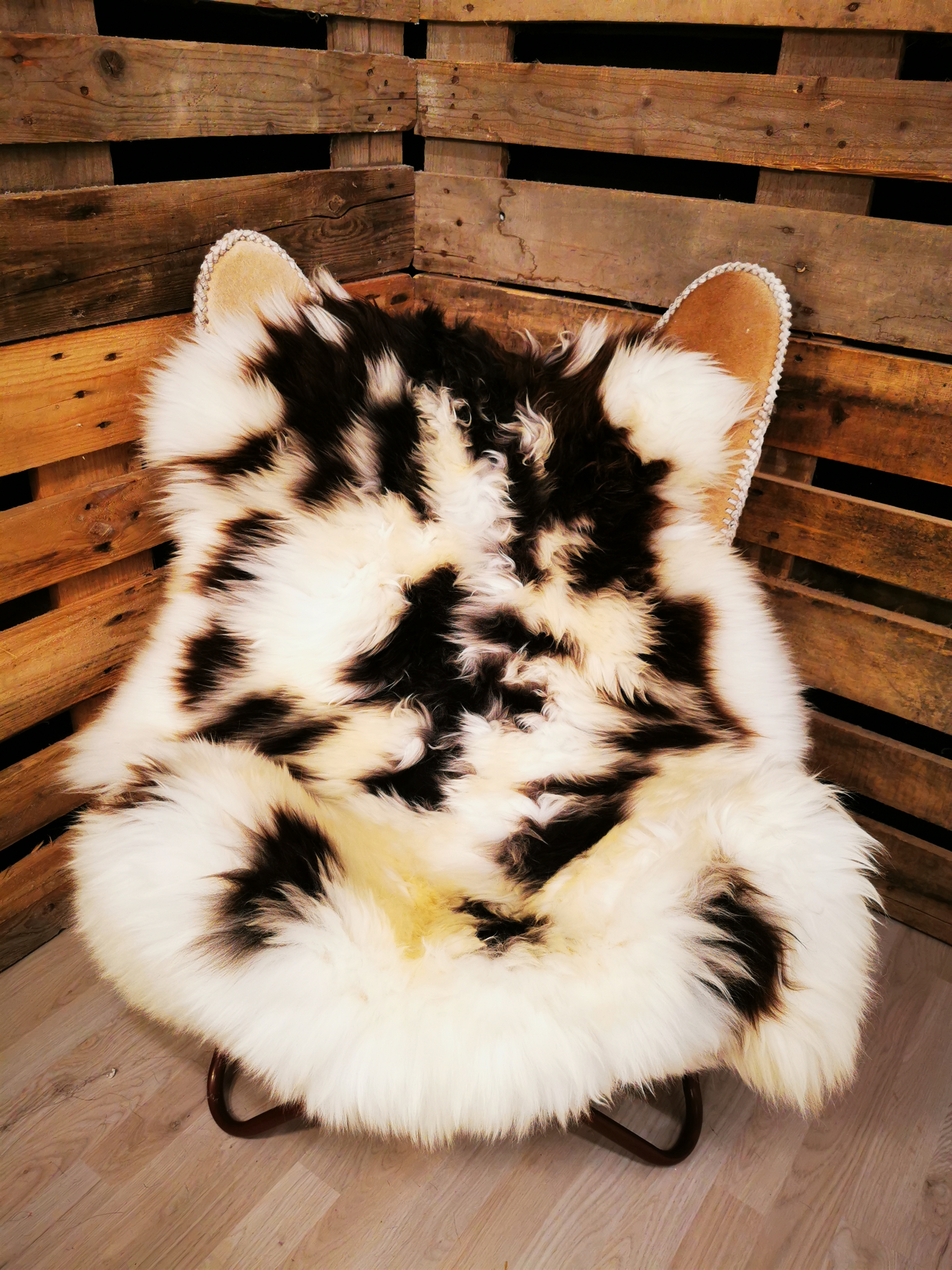 Skindet måler 135cm. Jacobs får er en meget sjælden fårerace som oprindeligt stammer fra Asien. Racen bliver omtalt i bibelen i forbindelse med apostlen Jacob (deraf navnet) og i 18hundrede tallet kom Jacob fåret til England. Jacob fåret er kendetegnet ved sort/grå/brun hvide farveaftegninger, både han og hun får kan have op til 6 horn og dets uld er højt værdsat. Skindene er store, klippede og meget fyldige. Skindet er både dekorativt men også meget velegnet som brugsskind, de sarte naturlige farvenuancer giver utallige anvendelsesmuligheder og som brugs og dekorationsskind på f.eks. spisebordsstole vil de være yderst velegnede.