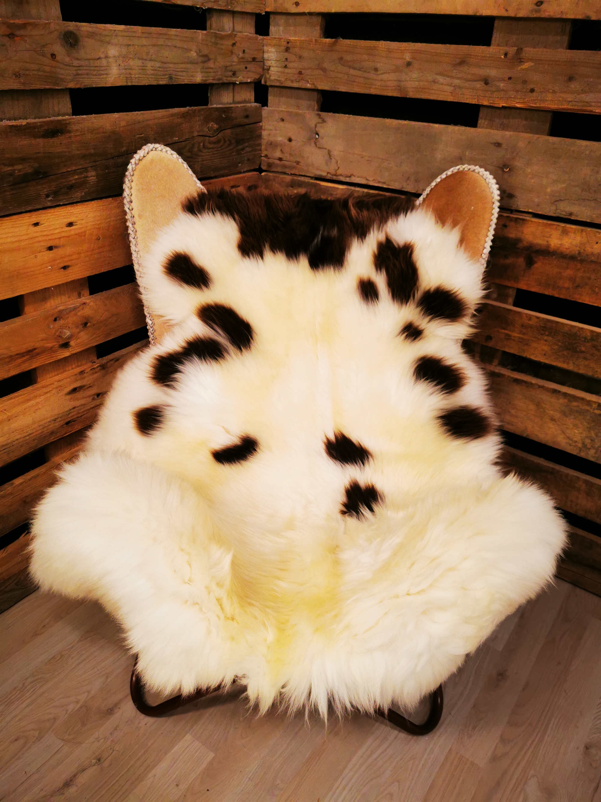 Skindet måler 115cm. Jacobs får er en meget sjælden fårerace som oprindeligt stammer fra Asien. Racen bliver omtalt i bibelen i forbindelse med apostlen Jacob (deraf navnet) og i 18hundrede tallet kom Jacob fåret til England. Jacob fåret er kendetegnet ved sort/grå/brun hvide farveaftegninger, både han og hun får kan have op til 6 horn og dets uld er højt værdsat. Skindene er store, klippede og meget fyldige. Skindet er både dekorativt men også meget velegnet som brugsskind, de sarte naturlige farvenuancer giver utallige anvendelsesmuligheder og som brugs og dekorationsskind på f.eks. spisebordsstole vil de være yderst velegnede.