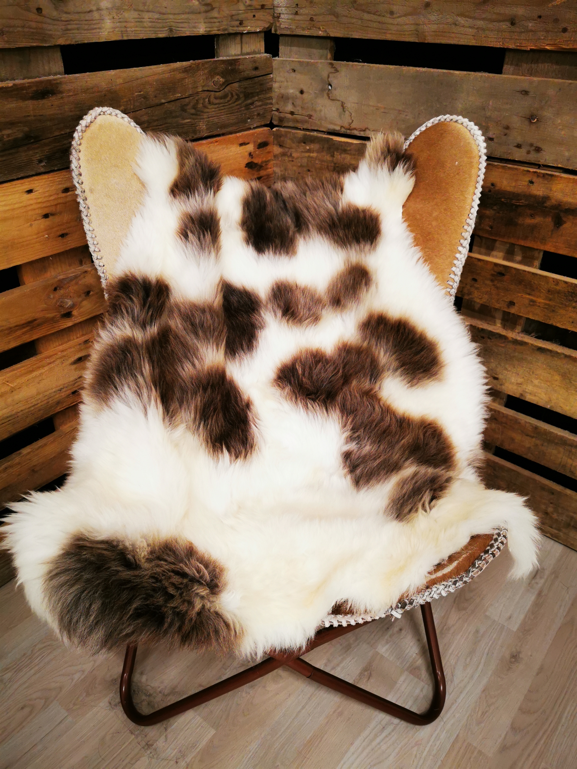 Skindet måler 125cm. Jacobs får er en meget sjælden fårerace som oprindeligt stammer fra Asien. Racen bliver omtalt i bibelen i forbindelse med apostlen Jacob (deraf navnet) og i 18hundrede tallet kom Jacob fåret til England. Jacob fåret er kendetegnet ved sort/grå/brun hvide farveaftegninger, både han og hun får kan have op til 6 horn og dets uld er højt værdsat. Skindene er store, klippede og meget fyldige. Skindet er både dekorativt men også meget velegnet som brugsskind, de sarte naturlige farvenuancer giver utallige anvendelsesmuligheder og som brugs og dekorationsskind på f.eks. spisebordsstole vil de være yderst velegnede.