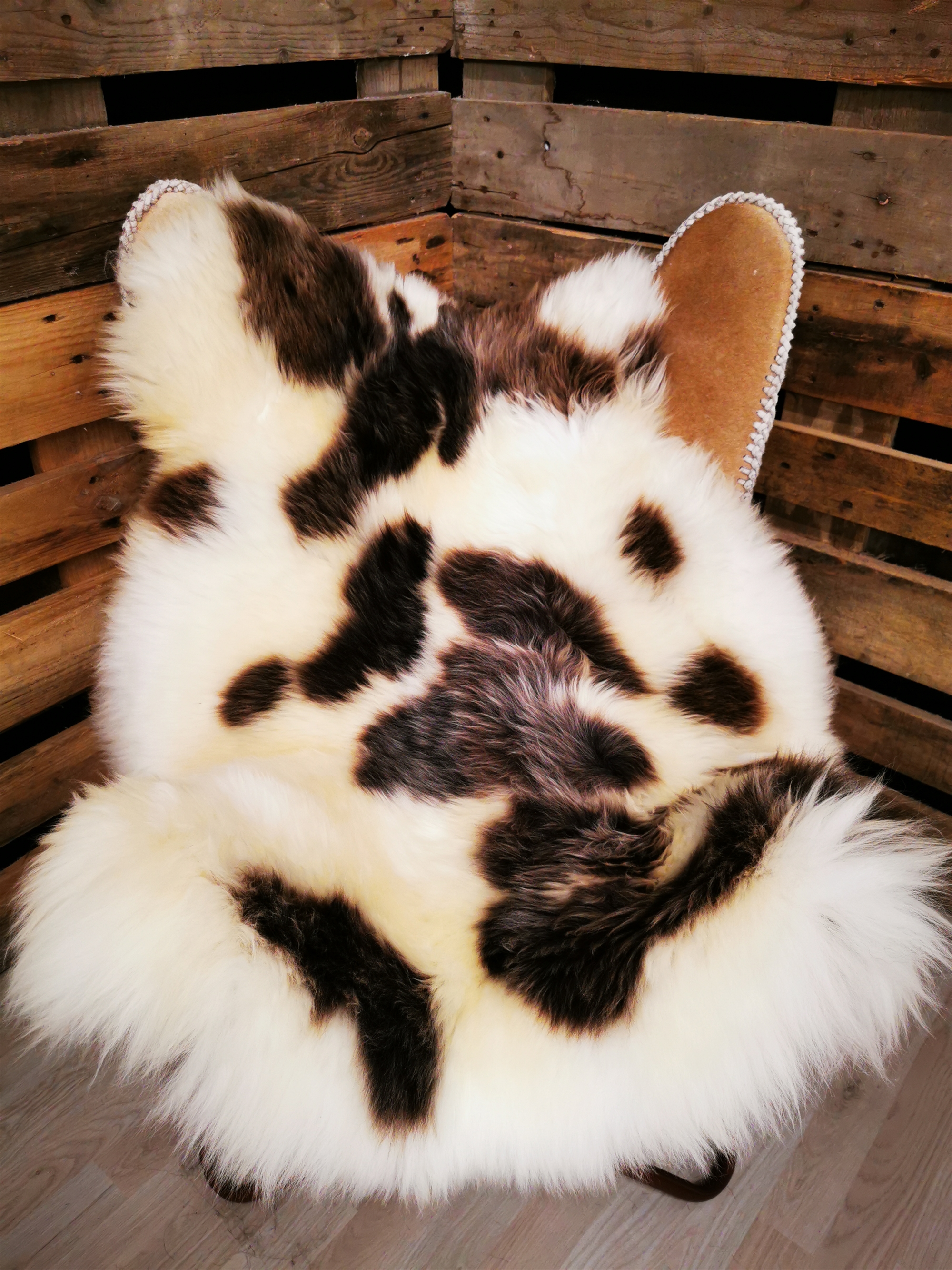 Skindet måler 130cm. Jacobs får er en meget sjælden fårerace som oprindeligt stammer fra Asien. Racen bliver omtalt i bibelen i forbindelse med apostlen Jacob (deraf navnet) og i 18hundrede tallet kom Jacob fåret til England. Jacob fåret er kendetegnet ved sort/grå/brun hvide farveaftegninger, både han og hun får kan have op til 6 horn og dets uld er højt værdsat. Skindene er store, klippede og meget fyldige. Skindet er både dekorativt men også meget velegnet som brugsskind, de sarte naturlige farvenuancer giver utallige anvendelsesmuligheder og som brugs og dekorationsskind på f.eks. spisebordsstole vil de være yderst velegnede.