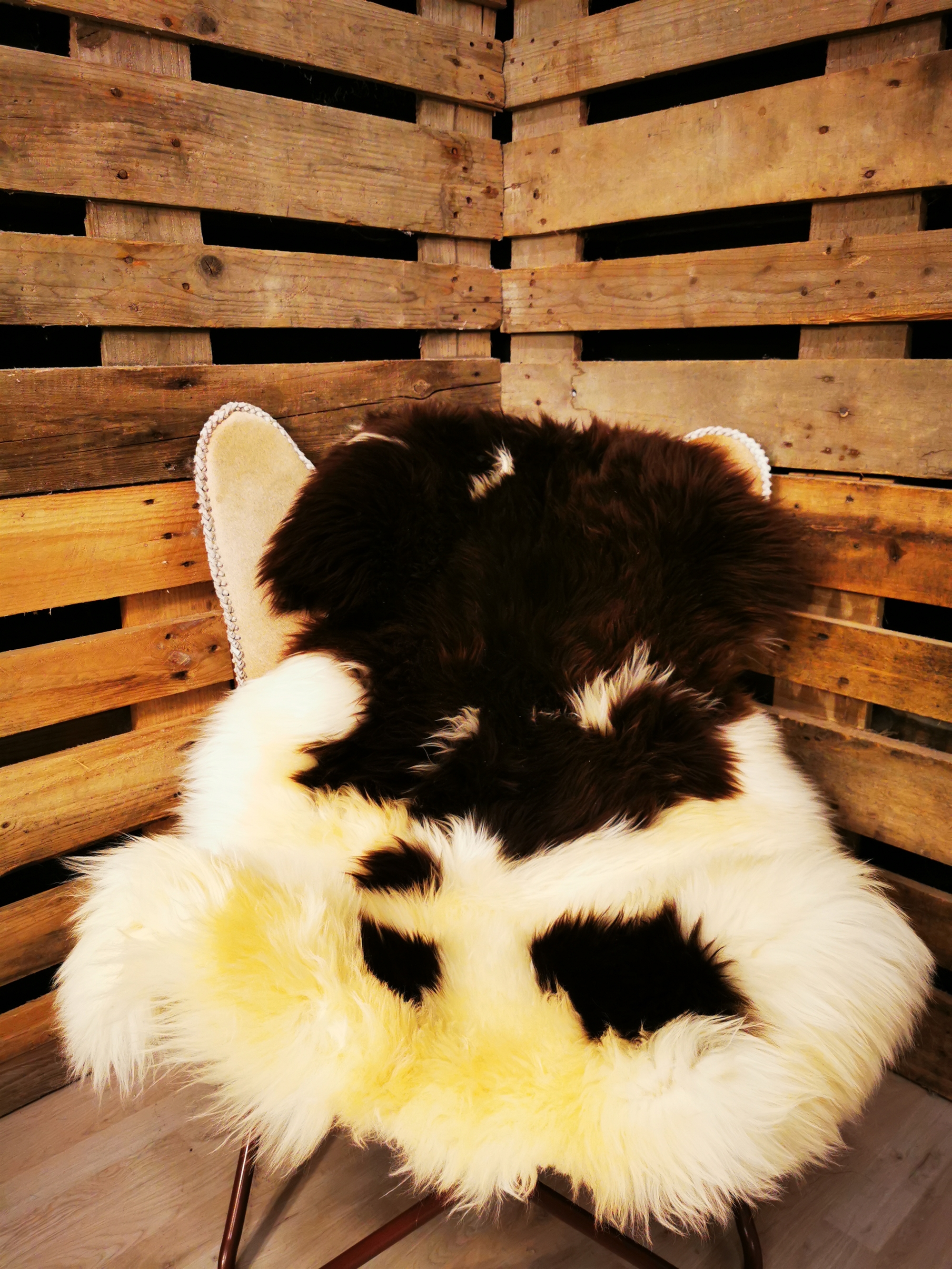 Skindet måler 130cm. Jacobs får er en meget sjælden fårerace som oprindeligt stammer fra Asien. Racen bliver omtalt i bibelen i forbindelse med apostlen Jacob (deraf navnet) og i 18hundrede tallet kom Jacob fåret til England. Jacob fåret er kendetegnet ved sort/grå/brun hvide farveaftegninger, både han og hun får kan have op til 6 horn og dets uld er højt værdsat. Skindene er store, klippede og meget fyldige. Skindet er både dekorativt men også meget velegnet som brugsskind, de sarte naturlige farvenuancer giver utallige anvendelsesmuligheder og som brugs og dekorationsskind på f.eks. spisebordsstole vil de være yderst velegnede.