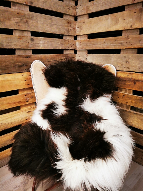 Skindet måler 130cm. Jacobs får er en meget sjælden fårerace som oprindeligt stammer fra Asien. Racen bliver omtalt i bibelen i forbindelse med apostlen Jacob (deraf navnet) og i 18hundrede tallet kom Jacob fåret til England. Jacob fåret er kendetegnet ved sort/grå/brun hvide farveaftegninger, både han og hun får kan have op til 6 horn og dets uld er højt værdsat. Skindene er store, klippede og meget fyldige. Skindet er både dekorativt men også meget velegnet som brugsskind, de sarte naturlige farvenuancer giver utallige anvendelsesmuligheder og som brugs og dekorationsskind på f.eks. spisebordsstole vil de være yderst velegnede.