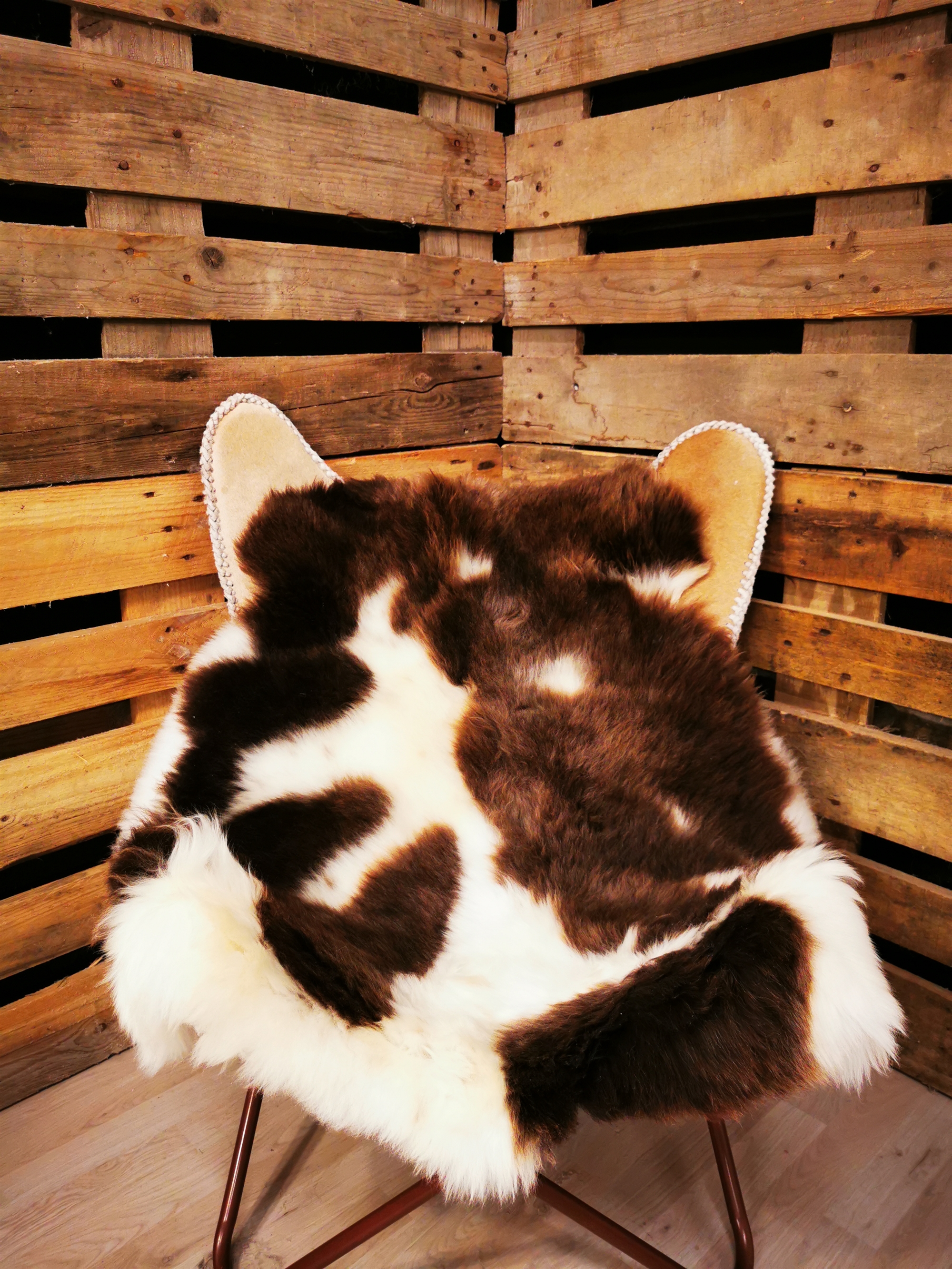 Skindet måler 120cm. Jacobs får er en meget sjælden fårerace som oprindeligt stammer fra Asien. Racen bliver omtalt i bibelen i forbindelse med apostlen Jacob (deraf navnet) og i 18hundrede tallet kom Jacob fåret til England. Jacob fåret er kendetegnet ved sort/grå/brun hvide farveaftegninger, både han og hun får kan have op til 6 horn og dets uld er højt værdsat. Skindene er store, klippede og meget fyldige. Skindet er både dekorativt men også meget velegnet som brugsskind, de sarte naturlige farvenuancer giver utallige anvendelsesmuligheder og som brugs og dekorationsskind på f.eks. spisebordsstole vil de være yderst velegnede.