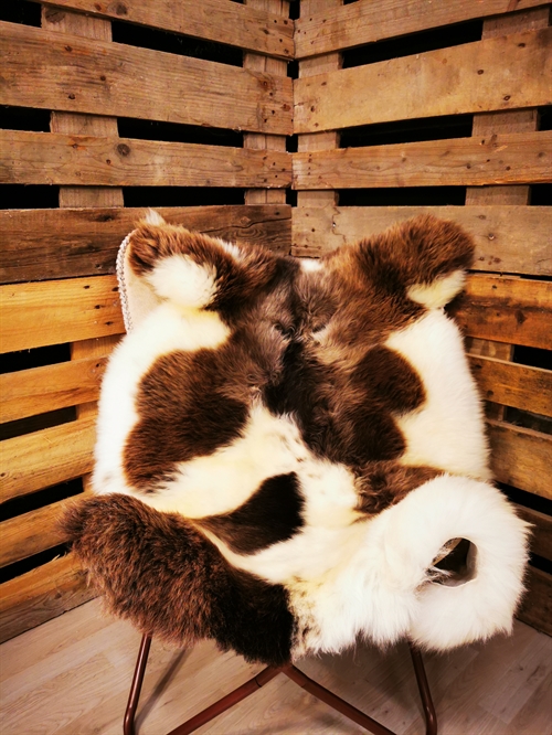 Skindet måler 130cm. Jacobs får er en meget sjælden fårerace som oprindeligt stammer fra Asien. Racen bliver omtalt i bibelen i forbindelse med apostlen Jacob (deraf navnet) og i 18hundrede tallet kom Jacob fåret til England. Jacob fåret er kendetegnet ved sort/grå/brun hvide farveaftegninger, både han og hun får kan have op til 6 horn og dets uld er højt værdsat. Skindene er store, klippede og meget fyldige. Skindet er både dekorativt men også meget velegnet som brugsskind, de sarte naturlige farvenuancer giver utallige anvendelsesmuligheder og som brugs og dekorationsskind på f.eks. spisebordsstole vil de være yderst velegnede.