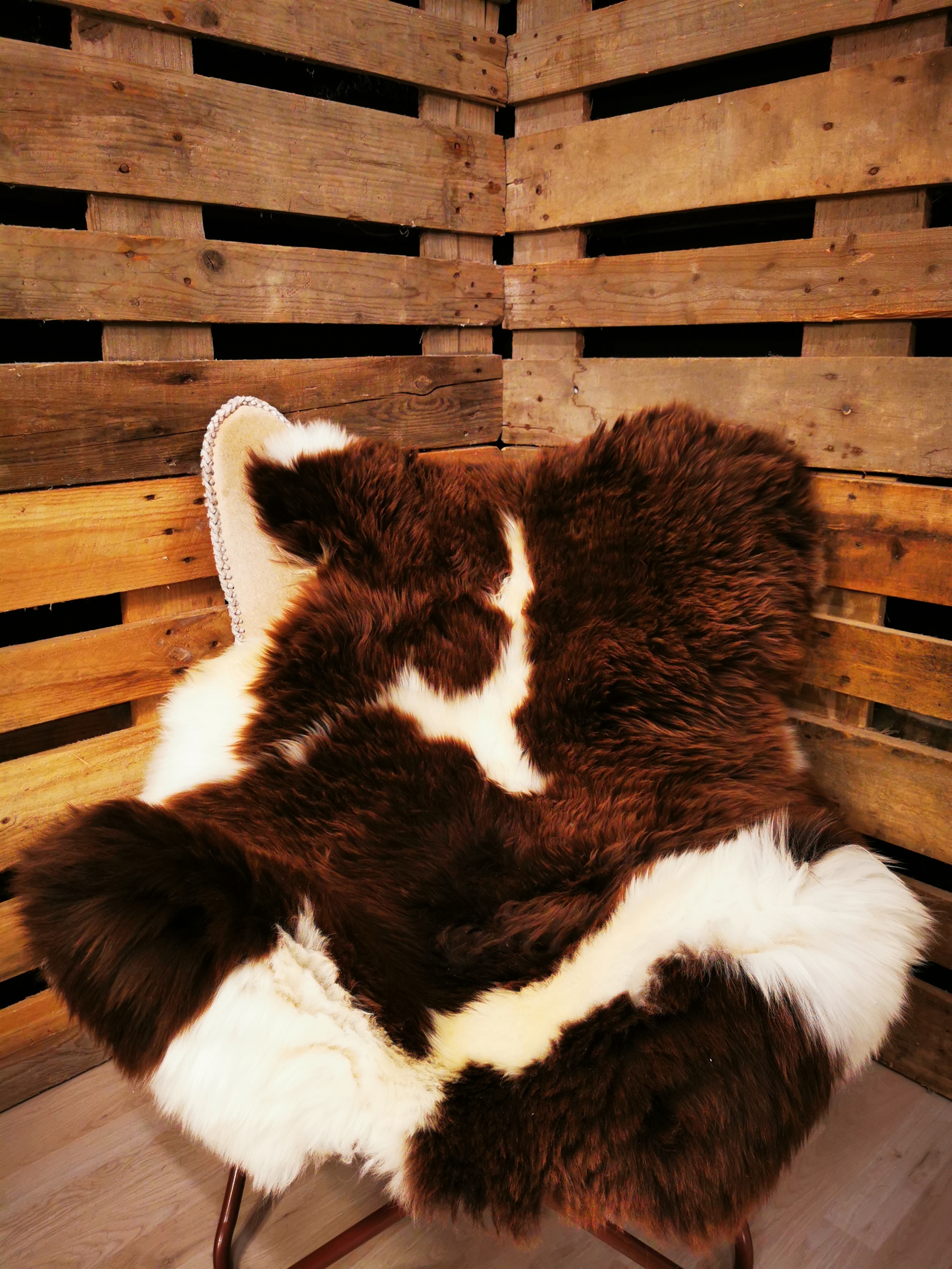 Skindet måler 130cm. Jacobs får er en meget sjælden fårerace som oprindeligt stammer fra Asien. Racen bliver omtalt i bibelen i forbindelse med apostlen Jacob (deraf navnet) og i 18hundrede tallet kom Jacob fåret til England. Jacob fåret er kendetegnet ved sort/grå/brun hvide farveaftegninger, både han og hun får kan have op til 6 horn og dets uld er højt værdsat. Skindene er store, klippede og meget fyldige. Skindet er både dekorativt men også meget velegnet som brugsskind, de sarte naturlige farvenuancer giver utallige anvendelsesmuligheder og som brugs og dekorationsskind på f.eks. spisebordsstole vil de være yderst velegnede.