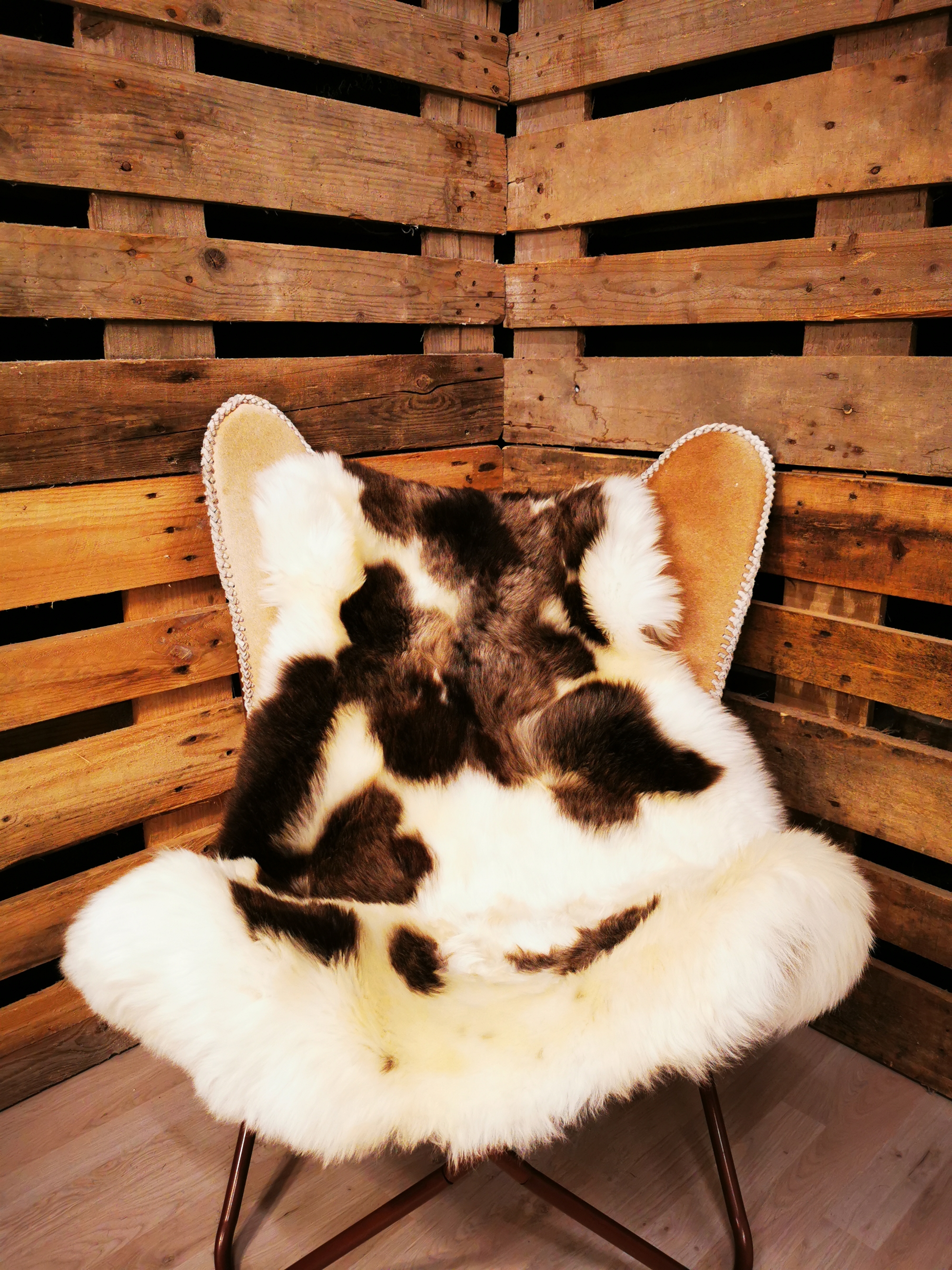 Skindet måler 120cm. Jacobs får er en meget sjælden fårerace som oprindeligt stammer fra Asien. Racen bliver omtalt i bibelen i forbindelse med apostlen Jacob (deraf navnet) og i 18hundrede tallet kom Jacob fåret til England. Jacob fåret er kendetegnet ved sort/grå/brun hvide farveaftegninger, både han og hun får kan have op til 6 horn og dets uld er højt værdsat. Skindene er store, klippede og meget fyldige. Skindet er både dekorativt men også meget velegnet som brugsskind, de sarte naturlige farvenuancer giver utallige anvendelsesmuligheder og som brugs og dekorationsskind på f.eks. spisebordsstole vil de være yderst velegnede.