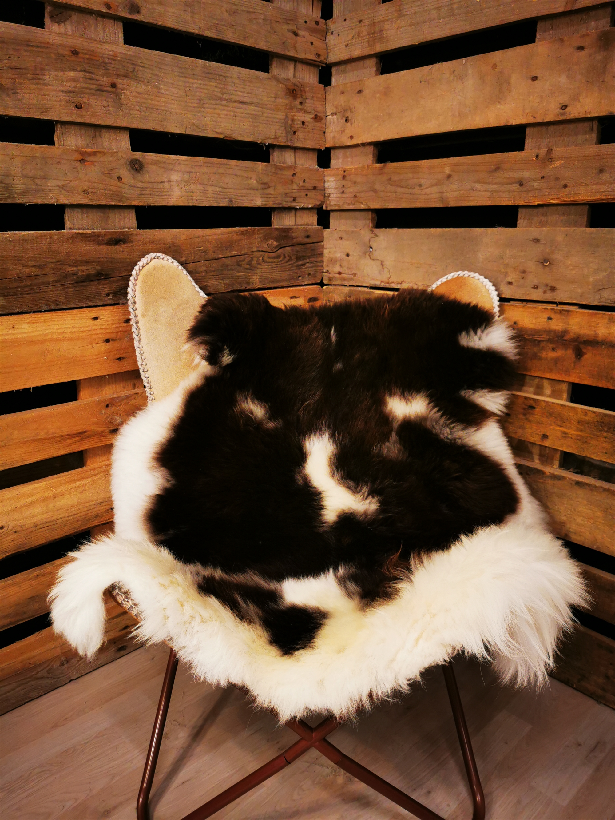 Skindet måler 115cm. Jacobs får er en meget sjælden fårerace som oprindeligt stammer fra Asien. Racen bliver omtalt i bibelen i forbindelse med apostlen Jacob (deraf navnet) og i 18hundrede tallet kom Jacob fåret til England. Jacob fåret er kendetegnet ved sort/grå/brun hvide farveaftegninger, både han og hun får kan have op til 6 horn og dets uld er højt værdsat. Skindene er store, klippede og meget fyldige. Skindet er både dekorativt men også meget velegnet som brugsskind, de sarte naturlige farvenuancer giver utallige anvendelsesmuligheder og som brugs og dekorationsskind på f.eks. spisebordsstole vil de være yderst velegnede.