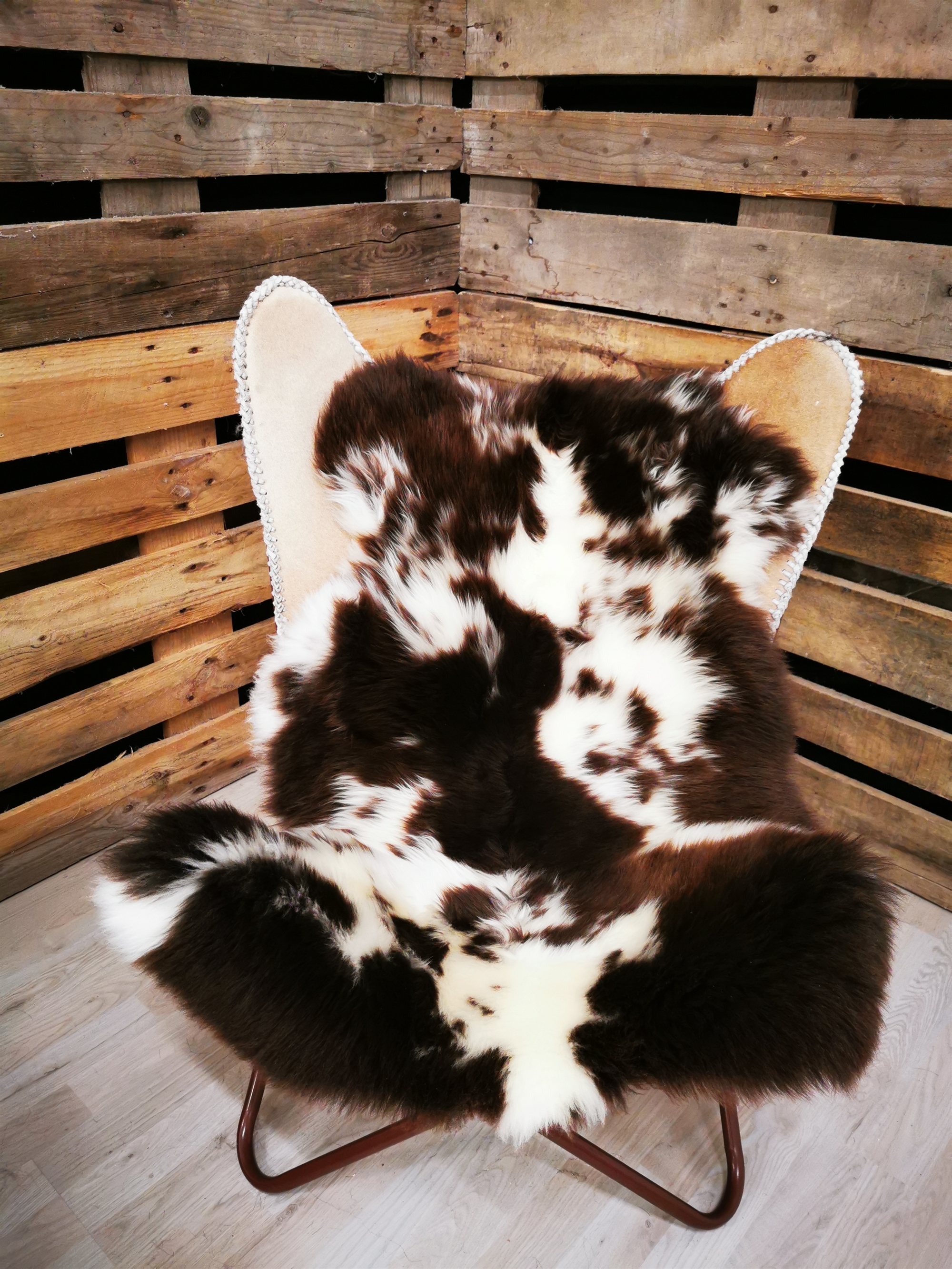 Skindet måler 120cm. Jacobs får er en meget sjælden fårerace som oprindeligt stammer fra Asien. Racen bliver omtalt i bibelen i forbindelse med apostlen Jacob (deraf navnet) og i 18hundrede tallet kom Jacob fåret til England. Jacob fåret er kendetegnet ved sort/grå/brun hvide farveaftegninger, både han og hun får kan have op til 6 horn og dets uld er højt værdsat. Skindene er store, klippede og meget fyldige. Skindet er både dekorativt men også meget velegnet som brugsskind, de sarte naturlige farvenuancer giver utallige anvendelsesmuligheder og som brugs og dekorationsskind på f.eks. spisebordsstole vil de være yderst velegnede.