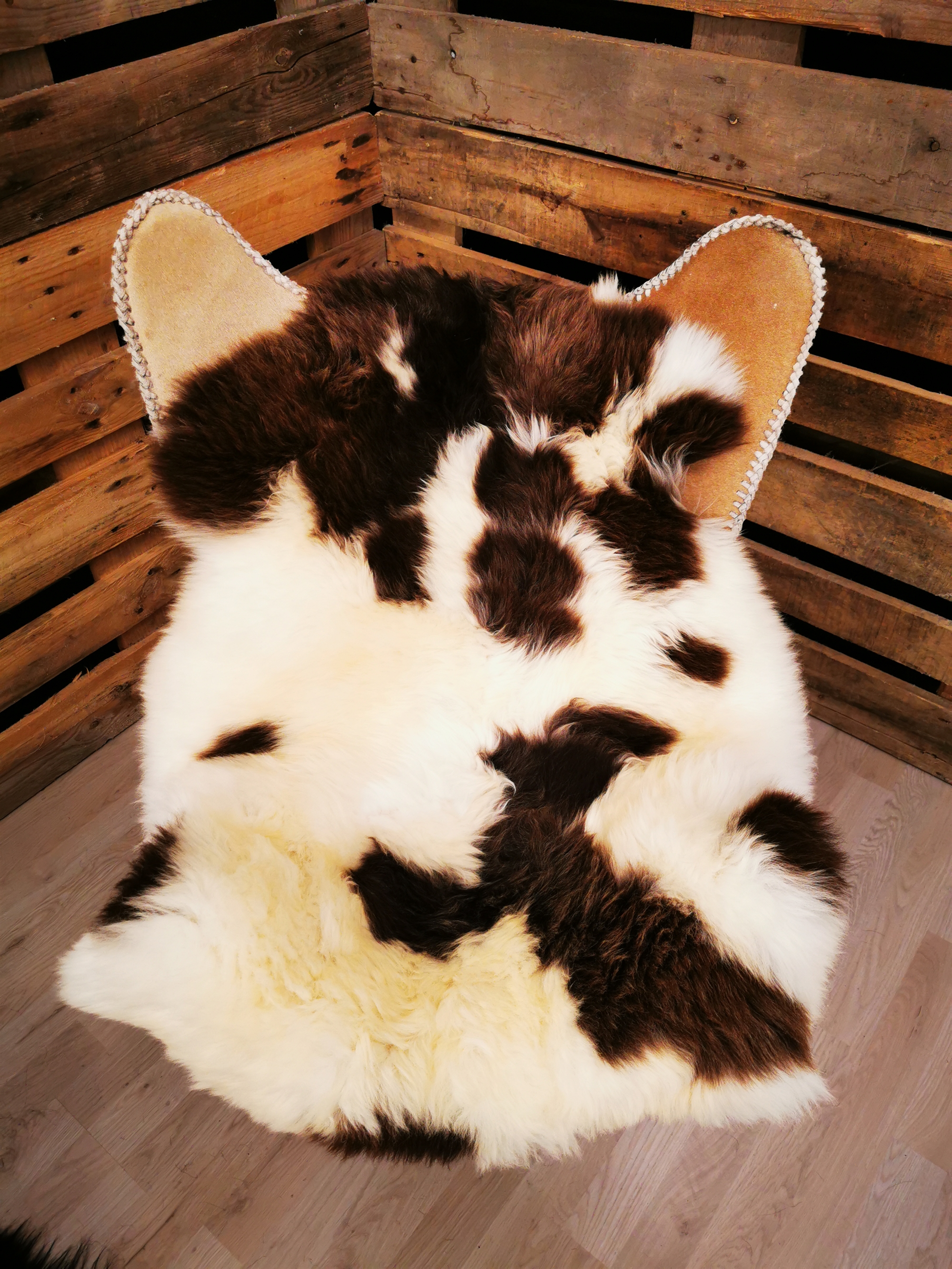 Skindet måler 120cm. Jacobs får er en meget sjælden fårerace som oprindeligt stammer fra Asien. Racen bliver omtalt i bibelen i forbindelse med apostlen Jacob (deraf navnet) og i 18hundrede tallet kom Jacob fåret til England. Jacob fåret er kendetegnet ved sort/grå/brun hvide farveaftegninger, både han og hun får kan have op til 6 horn og dets uld er højt værdsat. Skindene er store, klippede og meget fyldige. Skindet er både dekorativt men også meget velegnet som brugsskind, de sarte naturlige farvenuancer giver utallige anvendelsesmuligheder og som brugs og dekorationsskind på f.eks. spisebordsstole vil de være yderst velegnede.