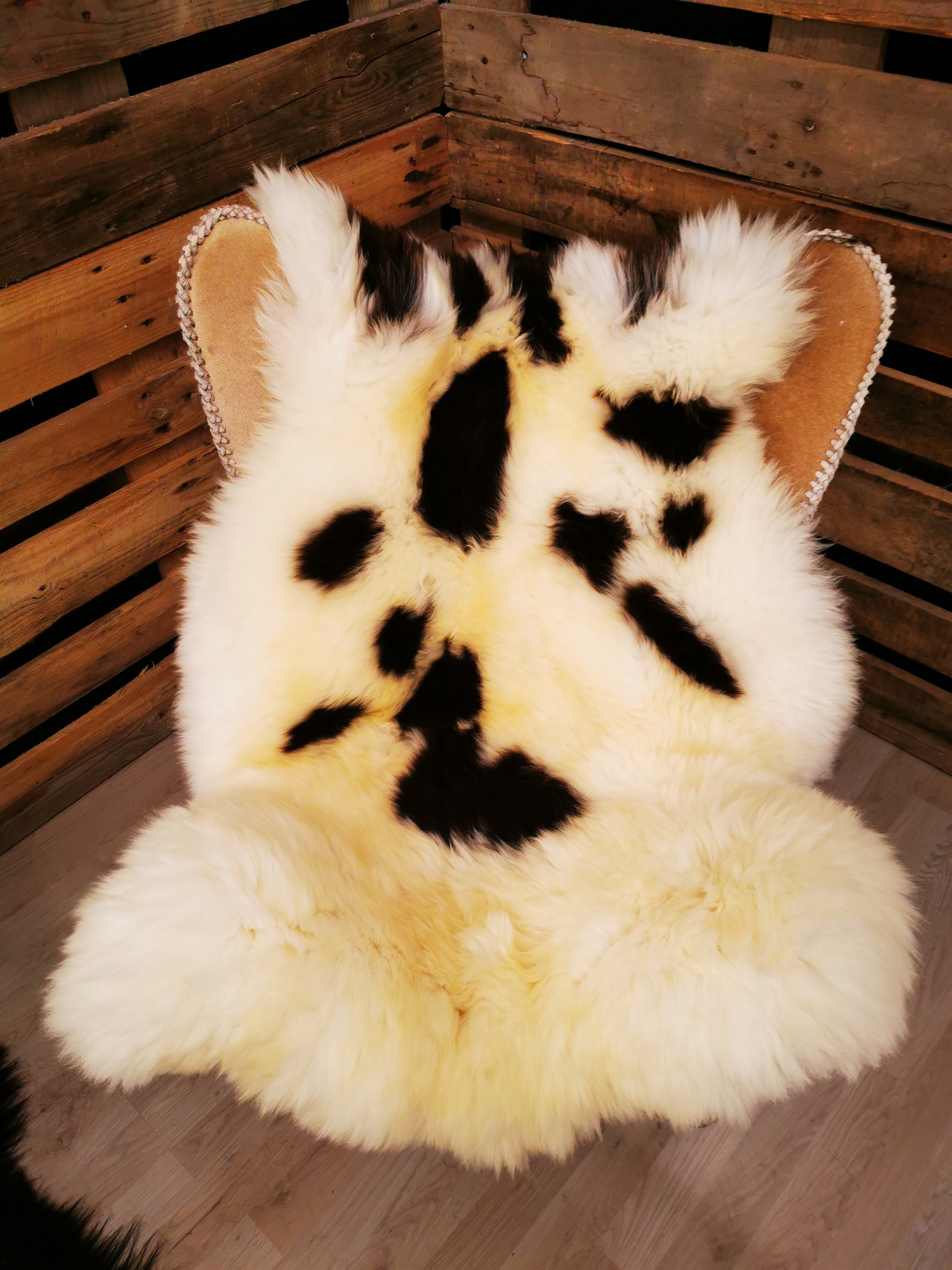 Skindet måler 135cm. Jacobs får er en meget sjælden fårerace som oprindeligt stammer fra Asien. Racen bliver omtalt i bibelen i forbindelse med apostlen Jacob (deraf navnet) og i 18hundrede tallet kom Jacob fåret til England. Jacob fåret er kendetegnet ved sort/grå/brun hvide farveaftegninger, både han og hun får kan have op til 6 horn og dets uld er højt værdsat. Skindene er store, klippede og meget fyldige. Skindet er både dekorativt men også meget velegnet som brugsskind, de sarte naturlige farvenuancer giver utallige anvendelsesmuligheder og som brugs og dekorationsskind på f.eks. spisebordsstole vil de være yderst velegnede.